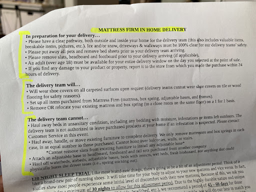 This was my first time ever picking a brand new bed (in person)! When I walked in the store, I was greeted by a you gal with red hair, (can't think of her name). She was friendly and helpful. I am such an indecisive person and I likely spent more than 2 hours there trying to pick my mattress. She was informative and knowledgeable. She helped me narrow down the choices based on my needs and desires. I continually went back and fourth between four mattresses. She never once made fun of me or rushed me. As I slowly narrowed it down from four to three and two to "THE ONE", she began that computer work. At the last moment, I switched it up and went with my second to last choice. I felt terrible but she was so sweet. She had to jump through some computer and phone call hoops to get the paperwork switched out but never once complained or lost her smile. I also purchased an adjustable base and two pillows... (I did the same thing with the pillows 🤦♀️) I literally laid on my choice of mattress and got in my personal sleeping position tried each pillow before deciding on the perfect ones for me. Fast forward a few days to delivery day... The two men that arrived were kind, quick and efficient. They lightened the mood with a few jokes and just worked away. In the process of swapping my other brand new mattress out (I had just ordered a new bed in a box three weeks ago from Amazon and just hated it) I asked them to please wrap that one in plastic for me as I wanted to keep it brand new with no stains so I could sell it to recoup some of my money... they took the plastic off the brand new mattress and placed it over to three week old mattress. The next day, I am looking over at the three week old mattress and realized they made a mistake. (Totally accidental). You see, when they removed the New mattress from the truck and placed it one the ground, it was a wet muddy day, and there was a little mud on the plastic. Once inside, they removed the plastic inside out and set up my new base and mattress and synced the remote. When they were all done, they put that same plastic on my three week old mattress and the muddy side then became the inside... opes! My beautiful, pad protected, three week old mattress can no longer be sold as clean with no stains!!! I called the store and spoke with a guy named Matthew. He went above and beyond to be sure we were taken care of and satisfied. Thank you! Now, after three weeks of nearly no sleep or really bad sleep, I have since slept all night long and have woke up without pain and have felt refreshed! Best investment a person can make is for their sleep quality. I now know this! Thank you Mattress Firm for a great experience, even though there were a few bumps along the...