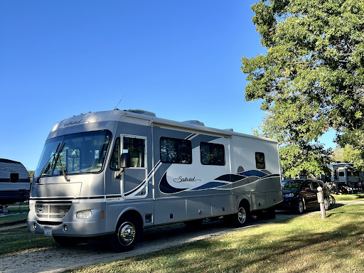 Campsite # 14 Our campsite was gravel back in with very little grass between the sites. It was wide, but not really long enough for our big rig. The campsite was level left to right, but definitely not front to back. We had full hookups with 50 & 30 #thifty It had a picnic table and fire ring with layover grill attachment. They offer propane refill and dump station. No wifi in the campground, but they offer it at the clubhouse. It is good enough for email and Googling. Starlink is capable of streaming. Verizon is okay for barely email.