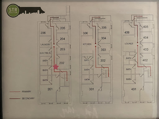 As far as the concept, the layout of the building makes sense, with two bathrooms per floor, laundry on the lowest level, kitchen above, and lounge on the top floor. With some extensive searching before booking, we were able to find some pictures of the layout. I have included the layout photo. The kitchen and lounge were in less repair than advertised, as you may be able to see in the photos I have provided. In the kitchen, there was no power to the microwave. The fridge and freezer were mostly full. The Keurig did work, but there are about 4 coffee cups total in the kitchen for the 18 units available to stay in. There is a security camera in the kitchen, which is unplugged.