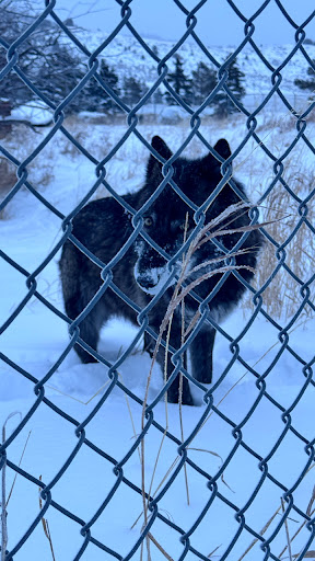 Shasta - the queen, the alpha female, the tundra wolf with long slender legs, black coloration and glowing orange eyes. She is Koaβs mate. She is a grand old lady and the only tundra wolf in the pack. The others are all timber wolves. Shasta is shy and regal. She almost never approaches humans. She dislikes Kiowa but is not aggressive toward her.