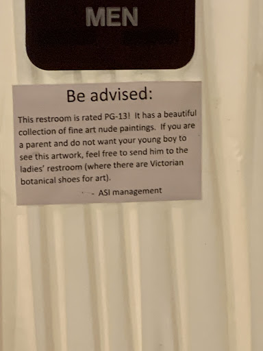 Additionally, I find the sign on the menâs restroom, that I mentioned earlier, to be disrespectful to women as well. After the sign states nude artwork is on display, it proceeds to say that if youâre uncomfortable with your son seeing the nude artwork that you can just send him to the womenâs restroom (Iâll include a photo). I think this is really disrespectful for two reasons: This is very much riding on the belief that men can just hand their problems off to women. This is disregarding to my humanity as it ignores the fact that I have my own problems to deal with, you canât just push yours onto me. This is disregarding the fact that the women might be uncomfortable with your son using this space thatâs been dedicated to women.