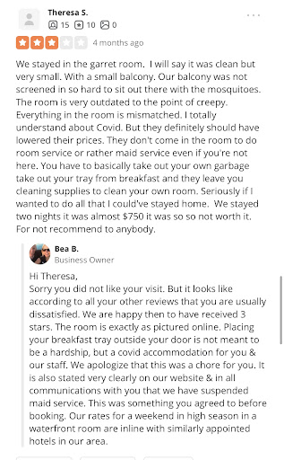 Read moreFirst, let me start off by saying that the view of this B&B is amazing, it truly is a very nice location. The breakfast (that they bring to your room) is delicious, and my fiancé and I enjoyed the old-style feel of the renovated home. Now, when my fiancé and I arrived (stayed for three nights) we went into the room and noticed the candies that were left on the nightstand contained nuts, I emailed the B&B prior to our arrival noting our breakfast choice and I stated having an allergy to nuts (they ask that on the form), and they returned with an email confirming that the allergy has been noted. Okay, that wasn't too much of an issue, seeing as I obviously must read all the labels on everything that I eat. Second, when we returned to the room for the night at around 10:30pm I began to turn down the bed, I cannot begin to tell you the amount of black hair on the fitted sheet, it was too much to pick off. This was the most upsetting thing. My fiancé called Zach (maintenance man on-call) and he was there within minutes to hand us new sheets and he also offered a complimentary bottle of wine, which was so incredibly sweet, and we truly appreciated the promptness. The last issue that we had dealt with was the extremely noisy group of people that were next to our room while eating breakfast each morning. We could not understand why they chose to sit where they did. We were on the main floor and there were no rooms next to us, they chose to eat at the entrance of the B&B when each room has their own balcony. Overall, we both truly wanted to love this place, but there were just too many things that has made us decide on...