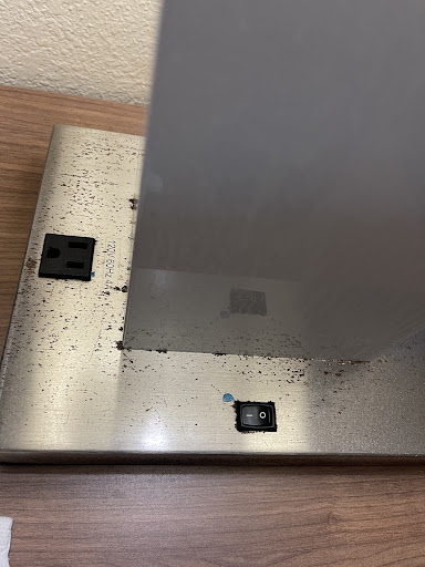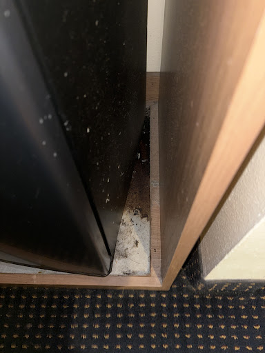 The bathroom was the worst of all: mold lined the walls and ceiling, and it was clear there had been a poorly patched ceiling leak in the corner of the room. When I turned on the bathroom sink, the water emitted a foul, stale odor as if it hadn’t been run in weeks — it took over 30 minutes of running the water before the smell began to fade. The shower stall was visibly patched and in poor condition, with mildew and grime along the edges. Dust and dirt lined the floors, suggesting the room had not been cleaned thoroughly between guests.