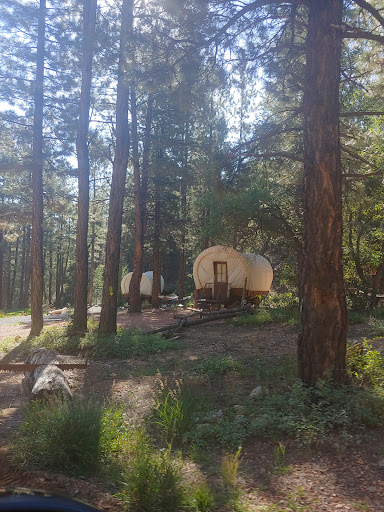 The drive up to Whispering Pines was absolutely beautiful, and as soon as we arrived the charm kicked in. We were greeted by a staggered row of Covered wagons nestled among the trees-like something straight out of a Lauara Ingalls book. I made a quick stop at the bathhouse and noticed some guests had left their personal items behind-maybe they were the only ones there overnight and felt comfortable doing so. That's the kind of vibe here; trusting , peaceful and low key. I even walked back again before we headed to Bryce, still thinking wow, they coudl at least be considerate . Only later_ after the Bryce trip and after flipping through the guest book - did we realize that each wagon has it's own private bathhouse with a key. So I inintentionally strolled into someone else's bathroom judging them, while they watched do it .. and never said a word. They were so gracious about it, and once we stopped laughing, I appreciated that grace even more.It's that kind of peaceful place, good hearted and full of surprises. Our wagon was totally authentic , yet clean, cozy and thoughtfully stocked with the essentials. It had a mini fridge, microwave, heat bearing amish- type fireplace, comfy- heated beds, and a private firepit, BBQ with shelter and a nice full size trashcan with liner-that smelled clean. One of my favorite touches was the self serve firewood on the honor system. When I went to the Trading Post to pay-I opened the door and oh my gosh, this magical twinkling light store full of cute merch, and other sweet touches all beautifullun arranged. Just like the firewood, everything there was honor basewd too. The entire place was immaculate. The bathrooms- once I found the right one was spotless ans smelled amazing.The kind of clean you see at a five star hotel. The heater is a blessing as well. The nights in mid-April dropped to 30 degrees. But that heater was such a treat. Warm seat and all. I highly recommend it if you are looking for a peaceful place and memorable getaway. There are quite a few other treasures there as well but you gotta stay thwere...