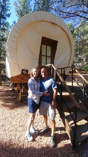 Ā Ā Ā Read moreThe drive up to Whispering Pines was absolutely beautiful, and as soon as we arrived the charm kicked in. We were greeted by a staggered row of Covered wagons nestled among the trees-like something straight out of a Lauara Ingalls book. I made a quick stop at the bathhouse and noticed some guests had left their personal items behind-maybe they were the only ones there overnight and felt comfortable doing so. That's the kind of vibe here; trusting , peaceful and low key. I even walked back again before we headed to Bryce, still thinking wow, they coudl at least be considerate . Only later_ after the Bryce trip and after flipping through the guest book - did we realize that each wagon has it's own private bathhouse with a key. So I inintentionally strolled into someone else's bathroom judging them, while they watched do it .. and never said a word. They were so gracious about it, and once we stopped laughing, I appreciated that grace even more.It's that kind of peaceful place, good hearted and full of surprises. Our wagon was totally authentic , yet clean, cozy and thoughtfully stocked with the essentials. It had a mini fridge, microwave, heat bearing amish- type fireplace, comfy- heated beds, and a private firepit, BBQ with shelter and a nice full size trashcan with liner-that smelled clean. One of my favorite touches was the self serve firewood on the honor system. When I went to the Trading Post to pay-I opened the door and oh my gosh, this magical twinkling light store full of cute merch, and other sweet touches all beautifullun arranged. Just like the firewood, everything there was honor basewd too. The entire place was immaculate. The bathrooms- once I found the right one was spotless ans smelled amazing.The kind of clean you see at a five star hotel. The heater is a blessing as well. The nights in mid-April dropped to 30 degrees. But that heater was such a treat. Warm seat and all. I highly recommend it if you are looking for a peaceful place and memorable getaway. There are quite a few other treasures there as well but you gotta stay thwere...