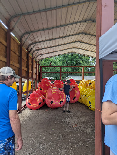 Upon arrival the tubing center was extremely busy and there was nowhere to park the truck and trailer in order to check-in, and no signs directing where to even go, or even where the campground was. (The cramped campground sits directly behind the general store.) Eventually the vehicles were moved out of the way and we maneuvered around them to our campsite near the end of a long tunnel-like road. Camping rigs and tow vehicles on either side made the road a one-lane stress-filled almost-disaster. Near the end of the road our site 37 appeared and immediately promised to be the worst choice we could have ever made as there was hardly any room even for a 19’ trailer, not to mention the truck. The neighbor’s sewer hookup and hose at site 38 ended up being right in front of our chairs under the awning where we generally sit and relax, and the picnic table was on the other side of our trailer next to the picnic table on site 36. I might add that our water hook-up, sewer, and electricity was so far away that it was obvious we’d be forced to dump our gray water on the way out Monday.
