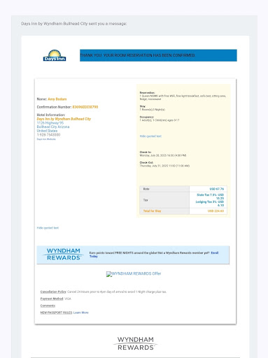 Read moreGot in late after driving down from Las Vegas, NV. This was for a 2 night stay. Got a text where I could check in off my phone. Address that pre-populated was partially wrong & I corrected. Night clerk @ check-in very nice. Room nice & clean, but there were a few issues. NO hangars, light bulb in floor lamp out, TV remote not working, TV itself when I hit power button had 1 Spanish channel working. The next morning I dropped a note off @ front desk with clerk. When I got in that night nothing had been fixed! Also room had not been cleaned or made up. Called front desk & was advised rooms not cleaned unless requested since Covid-19 had hit a few years back (was not advised this @ check-in & not a deal breaker). The clerk was very nice & apologetic about the other issues not being fixed. I guess the guy @ front desk in the morning wasn't a regular clerk & nothing in the maintenance log. The night clerk said she would come to room & try to fix TV after she was done with a guest. She arrive about 10 minutes later & was unable to get TV working. She offered me another room, but I didn't want to move upstairs. She took a note with the issues & said she would tell maintenance. The next morning I had a knock on the door & it was maintenance. Super nice, he had hangers, changed the bad light bulb & got the TV working with ALL the channels. I was able to catch the news before I checked out. I didn't have breakfast the first day, but had it day of check out. They had one of those Belgian waffle machines, but the batter looked like 1/2 batter, 1/2 gray water which was a disgusting soupy mixture. I alerted the front desk clerk & he said "one of the staff doesn't use the full bag of mix" (trying to save $$$?) & he quickly replaced the batter. The waffle tasted great & they had your typical other breakfast items hot/cold cereal, juice, bagels, etc. So despite the glitches it was a pretty good stay, nice room, comfortable bed, & all staff members very friendly. There were "cheaper" rooms across the river in Laughlin, but when you factor in those pesky resort fees this came out on top. Plus I'm a Wyndham Reward member & got points! I would stay here again. Other notes: There appeared to be a nice sized safe in the closet, but it didn't have an electronic lock which is standard @ most hotels I've stayed at. This had a key type lock so I suppose if you want to use the safe you get a key from the front desk? There was a grab bar in the bathroom OUTSIDE the tub by doorway. Might help getting into the tub, but no safety grab bar on inside tub...