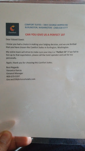 Read moreWe are a retired couple and we recently stayed at Comfort Suites Burlington Washington while on vacation visiting western Washington. We checked in with my service dog for seven nights and all went well upon initial check-in, and we declared that we had a service animal with us at that time. We filled out the pet paperwork and were told there would be no pet fee charged because our dog was a service animal. This was as expected. Caleb checked us in. ||When we came back into the lobby after gathering our belongings, the dog barked as we entered the lobby. Caleb immediately stood up and said, âThatâs not a service animal, service animals donât bark. I know what you are trying to do.â He then called me a liar and a scammer. An argument ensued regarding the law and service animals. Caleb insisted that he knew the law and demanded that we show him proof that our dog is a service animal or else be charged a pet fee. I told him again that I didnât have proof because under Federal and State law I didnât have to provide any kind of proof or certification, nor was he allowed to ask for it. I told him that I didnât have to show him anything and that in twelve years of traveling with a service animal had never had an issue. Itâs a violation of the Americans with Disabilities Act for him to demand any kind of certification or proof. Caleb insisted that he knew the law better than that that I was a liar and a scammer because he had been trained, and that there was a âlittle white cardâ that he needed to see else he would charge the pet fee. ||I could not believe how rudely and inhospitable we were being treated and Caleb did in fact illegally charge us a pet fee after we had already checked in.||Then things became worse. Instead of a warm welcome upon entering the hotel lobby each evening as we returned from the dayâs outing, Caleb gave us evil stares and/or animated laughter and finger-pointing at each encounter. We were being harassed and bullied and our civil rights were being violated by this insane moron.|| On checkout day we loaded the car and I noticed that we had a flat tire. We had been off-road some in the National Forests that we visited, so I just changed to the spare and didnât think much more about it that day. After arriving home, I went to have the tire repaired and learned that the tire had been slashed with what the tire guy thought may have been a box cutter.||I didnât believe for one second that the tire slashing was a random act.||I have since been in contact via email with the Hotelâs property manager, Scott Turbush. All he had to say about it was that he was sorry, but since we didnât complain during our stay then it was our fault, and that he would refund the pet fee as fair compensation. Fair compensation for what was an illegal charge to our credit card to begin with and nothing more. Turbush also declined my request to discuss this matter by phone rather than just exchanging...