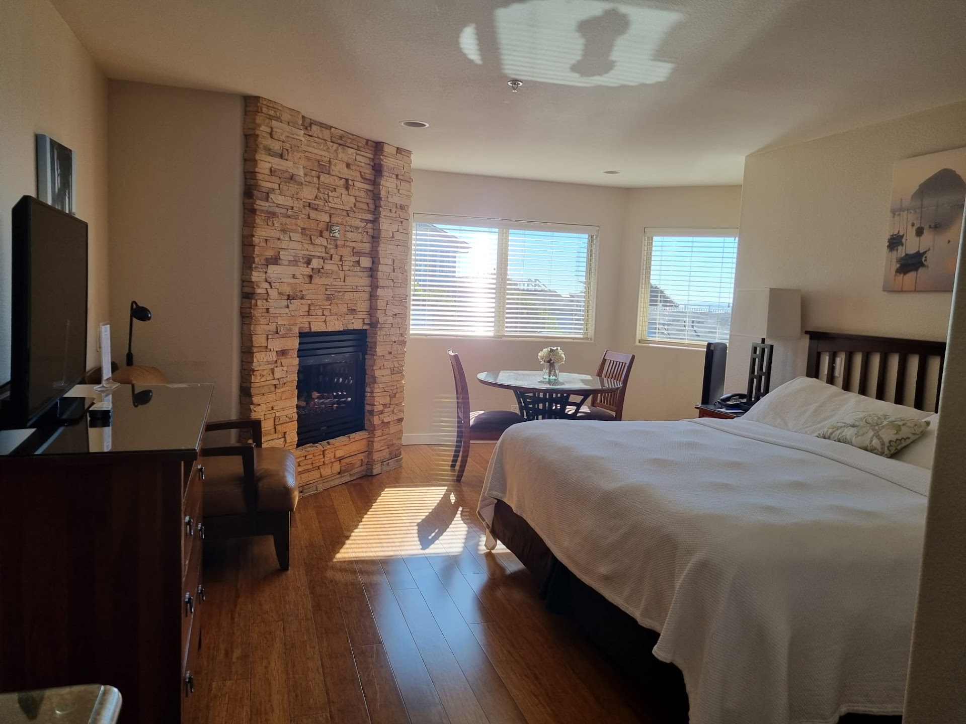 Read moreIf I could rate this absolute jewel of a hotel higher, I would. The accommodations, the staff and the gorgeous location have made it my favorite hotel I have stayed in to date. The story of our stay is a convoluted one. We had booked two nights as a stopover on a longer vacation in Southern California. The day before we were to leave from our Northern California home, we had a pet emergency that turned into a life or death situation for our beloved pet. It was too late for cancellation, but as our pet required days of hospitalization, we decided that we would try to make it for our second night. We were in communication with the lovely staff at all times, so they were aware of our situation. When we let them know that we would actually arrive for our last night of our reservation, they were kindly welcoming and genuinely glad that we were actually able to make it for the last night of our reservation. They didn't have to be that lovely - they had our money whether we showed up or not . Again, complications arose and we didn't arrive for our one night there until just before 9:00 p.m. on a rainy, foggy evening and we were stressed out basket cases. Our 6-hour drive turned into a 10-hour drive because of weather and traffic, so we were elated to actually get into our room. Our first floor, ocean front room did not disappoint. It was spacious, meticulously clean, and beautifully classic in design with quality furnishings and bedding. The star of the show, of course, was the huge glass slider and windows facing the ocean. It was so dark we couldn't actually see the ocean, but we could hear it. We cracked the door, turned on the fireplace, listened to the waves and enjoyed the thoughtful bottle of wine the staff placed in our room as a welcome. We had a delicious night sleep in the comfy beds, and woke to sunshine dancing on the sparkling blue ocean just beyond our stone patio. I was recovering from bilateral knee injuries, and was using a wheelchair part-time while traveling. The beautiful room and bathroom were certainly spacious enough to handle a wheelchair even if I needed to use it at all times. Accessing the property and the room in a wheelchair was easy. I would have gladly stayed the remaining days of our vacation at this hotel, but our other accommodations were non-refundable. We were so sad to have to leave and we will definitely be back. Sadly, they are already booked during our time off in July, so we will try again this fall. The ocean front rooms are absolutely superlative and worth the extra money if you can swing it. I can't wait to go back. This is a family-owned property, and we felt like new friends when we left even though we were there only one night. They were truly kind and compassionate, rising above what you would expect even in the hospitality business. We wish them continued success and prosperity with this...