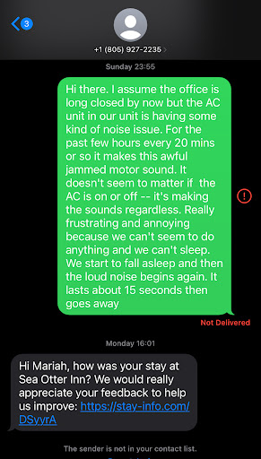 Read moreWe needed to head up to the area to check in on an older family member. Since I knew our journey would be shortly after Christmas, I decided that we would stay at Sea Otter Inn. We've been there many times in the past and have always had a pleasant stay. I checked with their Covid precautions and the website was very detailed on how they stay safe--including contactless check in with outdoor accessible rooms. They also included tickets to the Cambria Lights Festival--an outdoor safeguarded light display. Perfect. Then the shelter at home orders came. I called and the hotel assured me everything was fine. I paid over $400 a night to stay, which is pricey by all accounts.