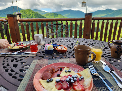 Read moreAbsolutely beautiful Wildberry Lodge with a stunning location, friendly owner and staff, and amazing food. We decided to splurge for our 30th anniversary, so we stayed in the Blackberry Suite. The king bed was comfy, the sitting room was nice, we even sat some on our private balcony. The bathroom was very large with lots of counter space. We never turned on the TV once while we there. The three breakfasts were all delicious and were all different. We ate them on the large deck enjoying the view. I highly recommend getting back to the lodge in time for the sunset. We brought back a pizza one night but it was still a bit too warm for sitting outside, so a staff member graciously cleared a table by a large window for us to eat. We then moved outside as it cooled off. The roads approaching the lodge are narrow and twisty, so it does take a bit of time to get there, but we liked being away from Asheville. I will admit that we did have a couple of issues with the very steep driveway in our Prius, but I figured out that you had to get a good start at the bottom and just keep going, but not too fast, as there are a couple of ridges in the road that I needed to slow down at with a vehicle likes ours, without a lot of clearance. That being said, the steep driveway was a small price to pay for the most spectacular views. There are even some nice trails going up the mountain that you can walk on. We saw some nice...