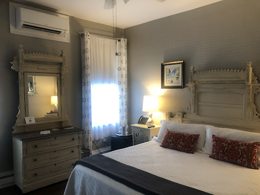 We chose to stay in Room #13, which is located on the 3rd floor. Room #13 overlooks Jackson Street and has a “glimpse” of the ocean. It is nicely decorated with a private bathroom. The room has the usual items…wall mounted TV, mini-fridge, iron/ironing board, hair dryer, and two cushioned chairs. Everything was very clean!