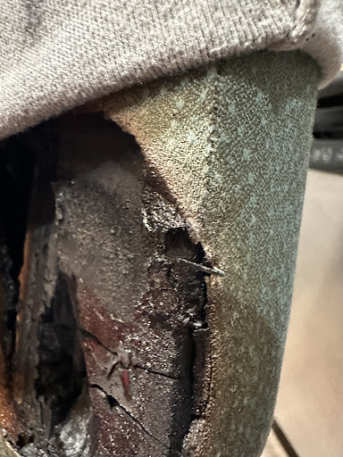 Next issue, I had just discovered, was this burnt out chair that they had placed a cover on (pictured). The ONLY reason I pulled the cover off was because my hand got stabbed by a really sharp piece of metal that turned out to be a staple that was partially ripped out and sticking out through the chair cover. I removed the cover to shove the staple back in and saw this giant burnt out portion of the chair! My toddler had been sitting on this chair during our stay and I’m glad it was me who got jabbed by the staple and not him.