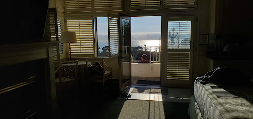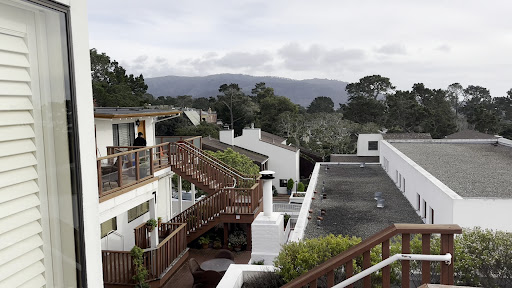 Nice small boutique Inn (12 rooms). The rooms are situated in a very non-uniform way, which makes it feel like you have much more privacy than the typical motel/hotel with rows of rooms with doors side-by-side and directly across. Everything is situated around a center patio with fireplace going all the time. Some of the bigger rooms have private balconies. It is only half a block off the main street (Ocean Ave), so it is very easy to walk around down town to eat, shop, whatever. In fact, when I arrived, I parked my car in their private parking garage and never drove the car again until the morning I left. It is 3 blocks off the beach access (maybe 5-6 block from the beach itself), and it is a bit over a half mile from the south entrance to Pebble Beach should you be going to an event there (so quite walkable instead of dealing with offsite parking and shuttles). They have other nice touches as well – coffee in the morning, brandy in the evening (I didn’t take advantage of either though). They provide bottled water on request as needed. They provide a $10 voucher for breakfast across the street at Il Fornio, but I didn’t use this because it didn’t open until 7:30am weekdays and 9am on weekends. Instead, I walked over to the Carmel Bakery only about 3 blocks away. My room I think is the smallest they have, but it was still plenty larger for 1 or 2 people. Two sitting chairs in addition to the bed, office style desk and chair next to the bed, large TV, small refrigerator, and a very nice bathroom. So very happy with the room overall. My only negative is there was no microwave in the room (even just a very small one...