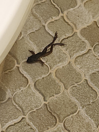 Made our reservation two days in advance. Called on the day of arrival to see what time we could check in and was told not until 4pm. Arrived at 4pm and room still wasn't ready. Had to wait an additional 15 minutes while housekeeping rushed to finish it. As soon as housekeeping left we entered the room (113). Everything seemed okay. Main room looked and smelled clean, however there were two sticky rings on the table where the previous occupants had set their drinking glasses or beverage containers and they had leaked juice or Kool-Aid or ??? Table had not been wiped down by housekeeping. After being in the room for about 15 minutes I needed to use the restroom. When I walked in I saw something on the floor between the toilet and tub. I looked closer and it was a dead frog!!! It had obviously been there for a little while as it it felt kind of stiff when I picked it up with tissue paper and flushed it down the toilet. As for the rest of the bathroom, the toilet seat was not fastened tightly and moved around. The shower head was only about as high as my nose and the tile around it was broken. The cold water faucet in the shower was not attached properly and felt like it was going to fall off.