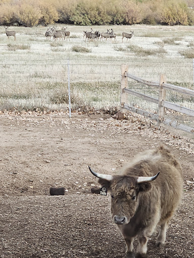 I found this place on airbnb and instantly had to make a visit to experience this. This place has by far been my favorite airbnb find by a landslide. We stayed in the smaller of the 3 cabins and it was absolutely perfect for me and my wife. The aesthetic of the room and the views of the beautiful red mountains out our window were absolutely breathtaking. The inside of the cabins was put together so perfect. And the best part was right outside our door we had our own private hot tub and the cutest highland cow that would always come up to us and hang out!!! The ranch itself has a lot more to offer too including a range of other animals to interact with such as other highland calves, goats, sheep, pigs, a donkey, an alpaca and chickens that you could all feed and even enter the caged areas of most of the animals. There is also fire pits, hammocks, corn hole, laundry on site with vending machines and at night everything was lit up so beautifully. I can write a whole book of my positive experiences here but wild this is enough to make anyone else want to visit!!!! And the owners, Brandon & Hollie have to be some of the most welcoming and friendly people I've ever met! They made the stay that much better. They did everything they could to make sure everything was to our liking. They really have something special here and are always outside working and taking care of the animals and cabins making sure everything is best as it can be!
