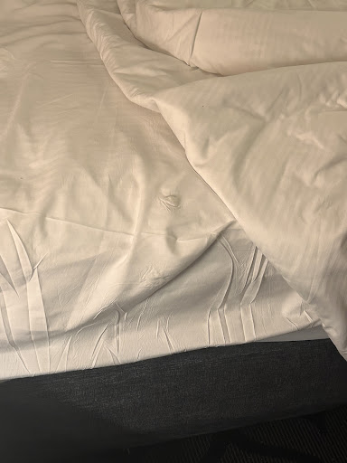 Room was ok, it was clean, spacious & at the end of the hall on the top floor, so it was quiet. No seating besides the bed and 1 desk chair; the bed had permanent indentations from the prior guests who had no seating. King size bed w/a queen size mattress pad and fitted sheets w/out elastic, so if you moved you touched the gross, bare mattress. AC works well, but blows out dust/dirt when you turn on the fan.