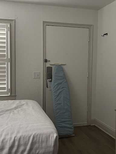 So we took the ironing board off the wall where it was hanging and leaned it up against the door so if someone were to break in, the clattering noise would awaken us. We need not have done so, because sleep eluded us in any event. First, the paper thin walls allowed us to clearly hear the TV in the adjacent room. When finally the neighboring guests turned off their TV, the thunder storm began and it sounded like it was raining inside the room.