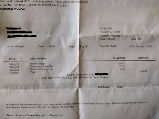 In the midst of all the issues that I had with the room, we were not offered any compensation such as free breakfast, additional reward points, or a reduction in the room cost. I was taking some of my family to CLT to catch a plane early on Saturday a.m. and the room that locked us out was only used for about three hours after the lockout incident.