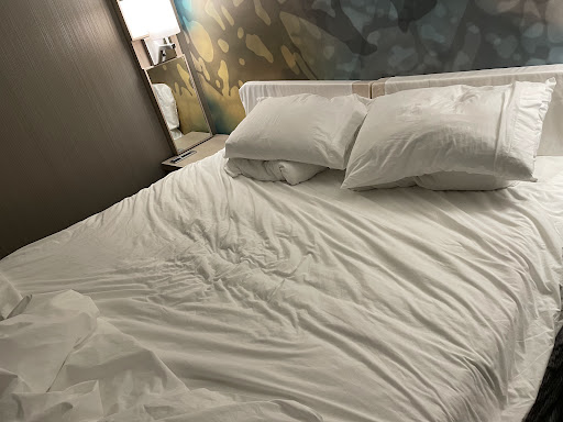 More negatives. We stayed in room 314, and there was no headboard. There were only some weird, foam pieces with pillow cases. You can feel the springs in the bed, as it is VERY firm. If you're a side sleeper like me, this will hurt your back! I didn't know popcorn ceilings were still a thing, but there was some questionable fluid on it. And the bathroom seemed clean, until you looked at all of the hair that was left in many areas. Lastly, you can hear all of the grinding, drilling, and pounding from construction and every conversation in the hallway. If you choose to stay...