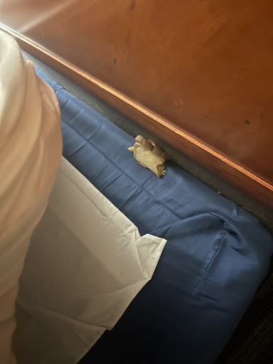 When we got in our room, it was atrocious. Iâm pretty sure the floors werenât vacuumed. I wouldnât even put my kid down to crawl or walk. The comforter had cigarette burns in it. The shelf that was attached to the wall was literally hanging crooked like nothing could be set on it because it would slide right off or possibly just disconnect completely from the wall.