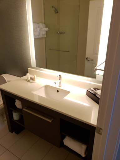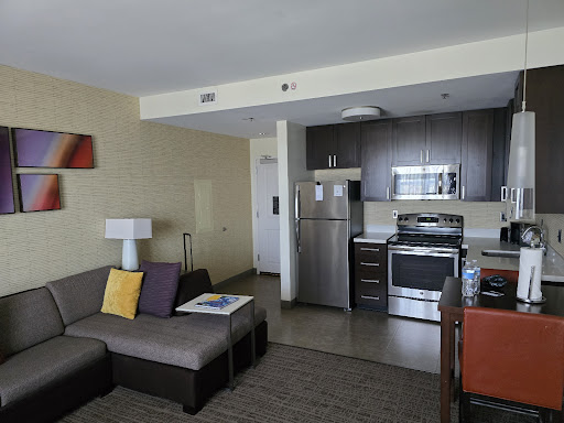 Each room is a suite with a complete kitchen, which includes a full-sized fridge & freezer and dishwasher. The freezers are equipped with ice makers. All rooms have at least an electric cooktop and if you opt for a larger suite, you can even score an oven. Dishes and utensils are provided in the rooms, as well as a few pots & pans. High speed internet access and smart TVs are standard. The beds are what youād expect from the Marriott brand, roomy and comfortable. Thereās ample storage space, with plenty of cabinets in the kitchen, a large desk w/enough working space, dressers w/drawers, a decent closet, nightstands on each side of the bed, and cubby spaces beneath the vanity in the bathroom.