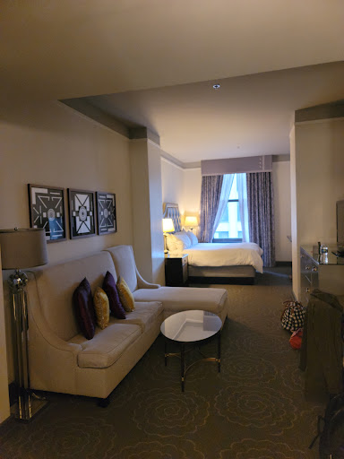 The room from a distance is very nice, but when you look a bit closer, you can tell it needs a bit of a facelift. The carpet is dated, and there were weird black stains in different areas of the floor. Also, the TV in front of our bed, was not functioning correctly. We did notify the front desk before we left for dinner, but was not fixed when we got back. I wasn't going to call maintenance at that late of an hour nor did I really care at that time.