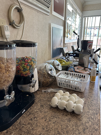 AMENITIES: PROS: the complementary breakfast bar though small is surprisingly quite nice. The pool is clean. CON: Pool could use some TLC/repairs. Right by the main road. Very loud during the day.