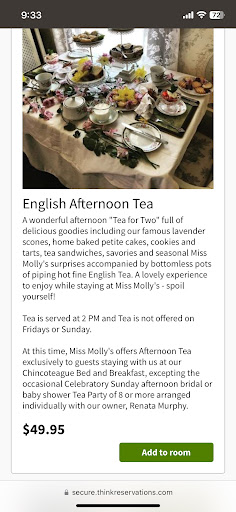 Read moreI was surprised after all the great reviews to be underwhelmed by Miss Mollyâs. The assistant innkeeper was very kind and attentive when she was around, the bed in the Bay Room was very comfy, breakfast delicious, and the house adorable, but from the time of booking our stay to the the time of our departure, my husband and I felt like they took liberties with their advertisements. One of their add-on amenities was mispriced on their website, and they let us know weâd have to pay 2x the advertised price if we wanted to keep the amenity. Their breakfast is advertised as âthree-courseâ but itâs really just three items: a waffle with a side of blueberries and a biscuit. It was the best biscuit Iâve ever had, but I wouldnât call it a course. The house is quite small, and I found it difficult to maneuver in the hallways and in our room, and despite the wonderful array of teas, there was no water in the kettle and no accessible faucet to fill it up in.