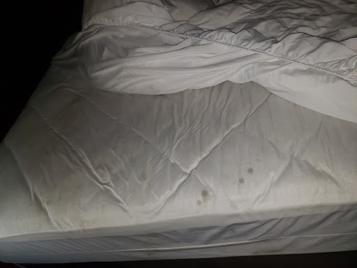 Our dog acted funny and would not relax. As the room A/C unit worked it seemed to make the room humid. That is when the bed sheets begin showing black dots/stains. I eliminated all but one towel and face towel that did not have either stains or hairs on them. At this point I had resigned myself to sleeping in my clothes on areas that appreared clean. It was late and we knew the most that would happen would be that we would get a put into another room. We needed to leave in under 5 hours so we dealt with our environment.