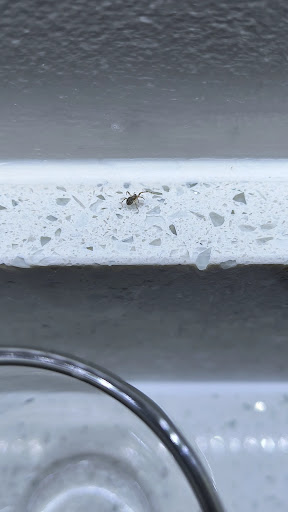 The shower had no shelf for soap and shampoo, only dried glue where one might have been. The shower itself - and the whole bathroom - is lovely. But there was an iron stain on the tile under the sink that would seem easy enough to clean, and the bottom of the bathroom door was missed when it was painted.