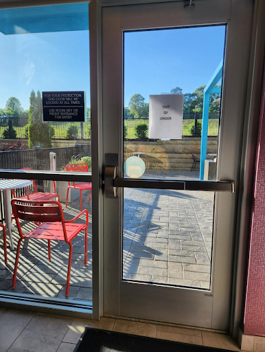 Read moreBeautiful location. Only 2 minutes from the University Clemson. Lovely stores within a 2 minute drive, Iso Iso ramen was super cute and had a great date. The hotel staff was friendly, but blunt and honest about some inconveniences, such as requesting some fresh towels as we had made a mess in our room and needed what we had to clean it, Leaving no wash clothes to shower with, stating that they usually would not be able to bring them up because only one staff member was at the desk. As we were leaving, we happened to look out the window and see staff members sitting on the "Out of Order" patio taking a smoke break, over our 2 night stay, at least 4 times. I had brought my service dog, which indicates to me that one would need an ADA room, or at least asked if I would like a larger room. Never got asked, and that is okay. The room was extremely tiny for any hotel. I had the intention to put my dog's medium sized kennel up if need be, and when we tried, it would not fit anywhere in the room, with the largest space being between the bed and the wall with the window, and it would not fit. So down it went and against the wall it sat. If you are a larger bodied individual, two people cannot pass each other from the bed to the bathroom without someone needing to sit on the bed. its a tight squeeze. The walls were dirty upon arrival, I noticed the scuff marks around the door, which did not surprise me, because that door was incredibly heavy (if you need any form of walking assistance you will likely fall) but the scuff marks under the tv did, I guess someone was playing Jenga with suitcases. -- those did not really interrupt my stay but the dirty shower did. Looking up as I am 5 foot, I saw long streaks of soap scum, I was able to take my finger and scrap away at it, and I thought to myself ah yes, Hilton quality. The rooms do not have coffee pots, or microwaves, in which I originally thought that's not the worst thing, but having one communal microwave which at one point had a line, and 24/7 coffee bar that was made by someone else, that was extremely strong and seemingly not fresh, even in the morning (this was not my only observation, but watching 6 people 4 of which were seniors dump their cups of coffee was a sign), -were two convinces I truly missed from other stays. I mean who would not want to go downstairs to the main lobby (forced to socialize), in their pjs and make a few scolding hot cups of coffee to take back up stairs to their rooms to sip on, only to find out they are nasty, ima skip that and hit Starbucks which was around the corner.
