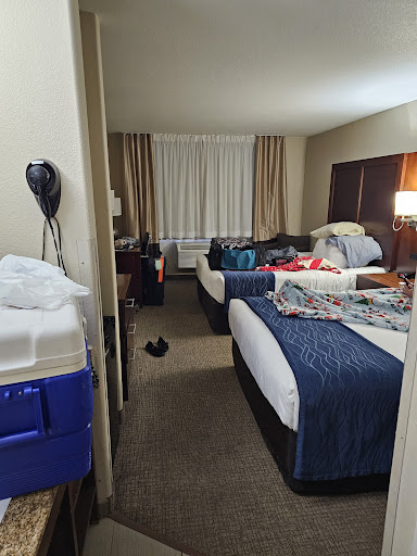 Read moreThis hotel serves its purpose in providing a place to stay, and is conveniently located. For the most part, things were clean as far as linens, bedding, however overall, regardless of normal wear and tear, the carpets in rooms, hallways, and stairways were visibly and texturally not clean. General plumbing issues required the request of a plunger in one room #418 (reported to housekeeping and front desk) and the sink faucet was loose creating difficulties alternating/finding hot and cold, patchwork in tub basin; while the other room (408) had sink drainage issues due to broken popup drain assembly; as I occupied the week before. I stayed here because it was cheaper than other hotels that offer accommodation and amenities at a higher standard. Regardless, of standard, any hotel will result in upkeep based on how well occupants choose to treat the structure and amenities as a paying guest. This Choice location (like another I have stayed at in a different state) has a general sense of drawing in a lower caliber crowd along with “pets” in noticeably different states of health and cleanliness. Staff did not attempt to require guests to subdue ongoing barking whether outside or in rooms without being asked to do so. As with any place people conduct themselves according to own will and decency, while others will push the limits and conduct themselves as civilized just beyond feral. To each their own with pot smoking, vaping or cigarette smoking, I don’t want to have to smell it or walk through the lingering plume upon hotel entry ways where I too have paid to be at. That being said, I would not stay at this location again, and found the Choice hotel location across town, less conveniently located for time here, however reasonable rates were financially optimal, and the general upkeep and overall sense of security is beyond comparison from the...