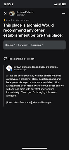 Read morePLEASE PLEASE PLEASE READ THE REVIEWS AND DO NOT STAY AT THIS HOTEL, OR ANY OTHER INTOWN SUITES LOCATION WITHIN THE VICINITY. I booked through the website, and I should not have. The rooms look NOTHING like the images on their website. They advertise offering a gym that doesn't even exist. The rooms were outdated and clearly not cleaned properly before check-in as their was still old food in and under the microwave and on the kitchen counters. They do not provide any of the basic items found in every hotel, not basic toiletries, not even toilet paper. They clearly dont even bother to repair things that are damaged and/or falling apart in the un-renovated rooms. There were burn marks on the ceiling, drawings, and holes in the walls, and the entire hotel smelled horrible. There were several different bugs all over our room, on the walls, in the AC unit, climbing in and out of the plumbing pipes and drains in the bathrooms. We were refused even a partial refund, which is fine because ultimately, I would rather lose out on a couple hundred bucks than risk taking home any sort of bugs that may infest my home. We didn't even stay in the room for more than half an hour before deciding it was too much of a liability and hazard to our own safety and health. The woman at the front desk was very friendly and nice, but the rest of the staff throughout the hotel were rude and had no issue speaking to us in unprofessional and condescending manners. I did not personally have an interaction with the owner, but judging the responses to criticism within the reviews I can tell any sort of conversation would be pointless as they are not only in denial, but an outright liar regarding the conditions of the hotel and unprofessional employees. I even considered trying to transfer our reservation to another intown suites an hour and a half away, but after reading those reviews and seeing images uploaded by guests I discovered it was no better off than this location. I personally watched several drug deals within the parking lot. I will be disputing the charges with my bank and providing images and videos of false advertisements. I will also be filing a complaint and report with the BBB and corporate as well as filing a complaint with the local health department, and I could care less if the owner fights it. I have pictures of what they falsely advertized on their website compared to what we received and picture and video proof of the conditions of the hotel and unprofessional interactions with staff. In this review, I have provided 4 of the "traditional rooms" falsely advertized pictures from the website along with a few of the pictures we took ourselves of what our room actually looked like. I don't understand how this is even legal, let alone how this hotel is still in business with how completely unprofessional...