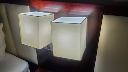 The first room I was placed in looked like it had been flooded or received some sort of major water damage. The leather from the headboards and desk was discolored, stained, and peeling. The lamp shades were damaged, torn, discolored, and stained. The lamps that had 2 bulbs only had 1 working bulb. The paint on the walls was peeled in some areas and looked soggy and damaged. The wood finish on the dresser and desk had major dings, scratches, and there was no desk chair at all. The only seat/chair in the room was dingy with major discolored and stained fabric. The smoke detector that should've been on the wall was not there, but I Iater found it in the nightstand drawer. The beds were minimally made as if the room was not prepared to have an occupant. The white bedsheets had major stains and discoloration. Everything in the room looked like items you would image finding in a dumpster.
