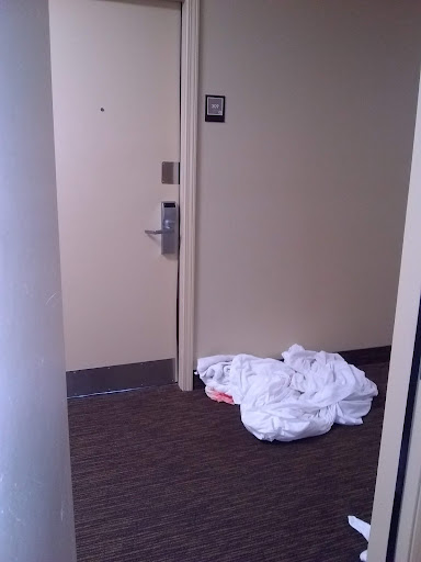 Every night we would have to un-prop the rear fire door as someone kept propping it open so that anyone could just come in. We would alert the staff just about every night, but it kept occurring. The guests doing this even resorted to bending the door mechanism so that the door would not latch shut. Hey management...Invest a few bucks into door alarms that cannot be disabled and sound loud alarms when left open for more than a few seconds!! Think about protecting your guests!