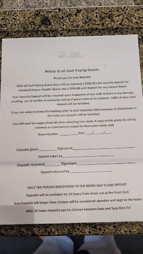 Now, with this form, I was also instructed that I needed to provide a deposit for the room, an amount of $200. IN CASH! I told the Mgr that there was no mention of this on the Best Western website, particularly the hotels sub-site within Best Western main site. No reply, didn't even look my way, continuing to stare at the TV with the NFL game playing. I checked my wallet, but I knew I didn't have that amount of cash on me, I don't carry any substantial amount on me. $40. I told him I would return.