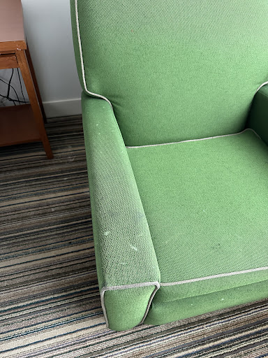 After the stained sheets were discovered, I walked to the desk chair and almost sat down. I stopped myself because it seemed too wobbly as I rolled it away from the desk. I turned it over and found two to three screws missing. I rolled it back under the desk and warned my wife and daughter to avoid it during the stay.