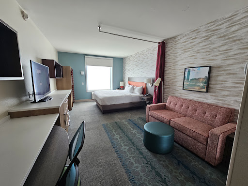 I have mixed feelings about this hotel. On one hand the size of the room was great, air worked very well, nice refrigerator, sink area. The lobby had a nice common area to rest or do computer work. There was always coffee available in the lobby when you needed it. On the other hand I originally booked a two queen bed suite and it was changed to a one bedroom king suite. While the extra space was very nice my son slept on the pull out sofa which is no big deal but didn’t look very clean or comfortable. We also had to request bedding for the sofa since housekeeping didn’t leave any. One front desk staffer was not that nice and upon arrival of our room the television in the living room didn’t work. So I went to the front desk and instead of sending someone up to look at it she went into all these different things I could try to do to fix and if that didn’t work then maintenance could come the next morning. So after several tries my husband finally got it reset and it started working. The door going into our bedroom wouldn’t stay open unless you open it all the way. If you didn’t it slammed shut very loudly. There is also a fire alarm with a flashing light that blinks every few seconds at night above the tv in the bedroom. That was a little irritating. The light in the bathroom blinked constantly. The floor in the bathroom had black skid marks from shoes I guess that had not been mopped. The black out shades were very nice instead of curtains and lots of space drawers to put things. For space and storage I definitely would give a 5 star rating. Breakfast was subpar at best. It was healthy options but not very tasty and they didn’t keep it picked up and clean. One morning the oatmeal was completely stuck together and dried up. They only serve until 9 during the week so one morning we didn’t get down until around 8:35 and the waffle batter was gone and no one to ask for any. Seemed like the staff was always in the back and hard to find. Our room also had a smokey/dusty smell upon arrival. It got better the longer we stayed so maybe coming from an old vacuum cleaner. All the staff was nice except one. Looked clean throughout. If you want the extra room and don’t care about breakfast and maybe little things wrong with the room try this hotel. It seemed ALL the doors slammed shut at this hotel. They also don’t replenish towels so you have to ask for things when you run out. Some hotels like Comfort Suites have started coming by each day asking if you need anything. There is a nice sitting area outside with afire pit if you want to use it and my husband liked the gym. I’m not saying I wouldn’t stay here again but the price would have to be right. The room size...