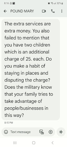 Read moreI would avoid this place unless its and elope wedding. Mama is a joy to speak with and very well spoken but that's about the extent of the service. The communication was poor leading up to the wedding trying to lock in details so we all understood how it would go. It was like pulling teeth to get her to discuss with us the details of how it would go. She assured me they do this often and to let them handle everything. Myself and the best man did not receive our Boutonnières we forgot about them with all that was going on. She replied they were on the table we should have grabbed them but I could not remember everything and she was no help prior to thew event. The venue was beautiful one of two great things I have to say about this venue. we had to fight her to set up extra lights and an arch which she gracefully allowed as long as we didn't disturb the grounds. As bride walked down the music went out for a second or two on her old beat up speaker. It went in and out several times during our dance as well I paused thinking the song was over then resumed, minute later it went out for a good 3 or 4 seconds I stopped and it played again I just called it and said it was good we will stop here, quite embarrassing. The photos were terrible as she used her phone to point and click no editing, tons of shots from back of peoples heads or making bad faces, no photo selection just a mass dump of garbage (photos included) maybe 5-10 good photos and few of them were because we hired a separate photographer and she asked to have us pause for great phots. It would be a travesty if these were all the photos we had received. The food was appalling and the order I admit we got a little confusing in text but over the phone we clarified what our selections were. we received 3 items we thought about adding a 4th for our 81 guest she said it would be an additional 300 to add sandwiches. We choose not to go with the sandwiches but got them in place of the Strawberry Tartlet with goat cheese. By doing this it left our vegetarian guests with nothing to choose from. Menu said Sausages Wrapped in Bacon, served with Mustard Dipping Sauce and as you can see from the photo it was sliced sausage that was it. The food was cold. We informed Mami that we would need several bottles of non-alcoholic champagne as we had many guest that did not drink they did not have any prepared and we waited until she fixed the situation. There was zero guidance from Mami or her staff transitioning from one event to the next she just stood behind people snapping photos of the back of people. When we got to the room late at night there was not one towel in our cottage not one. She lated said all we had to do was call or text and they would have brought some. you can see the text came, yes late but she never sent a response until the next night past 11pm. I must say the officiant was amazing hats off to him. communication was bad to start but I think it really was mami not him. I would really avoid this place if you have more than a few dozen...