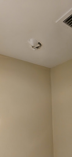 Back in our original room, more issues popped up: a smoke detector started chirping because of a dead battery and water was visibly leaking through the bathroom ceiling, which also had mold. We reported everything, but help was delayed or never arrived. I wasn't the only one upset — the lobby was full of guests complaining about their rooms, with reports of no towels, broken locks, missing essentials, and not even having a room assigned.