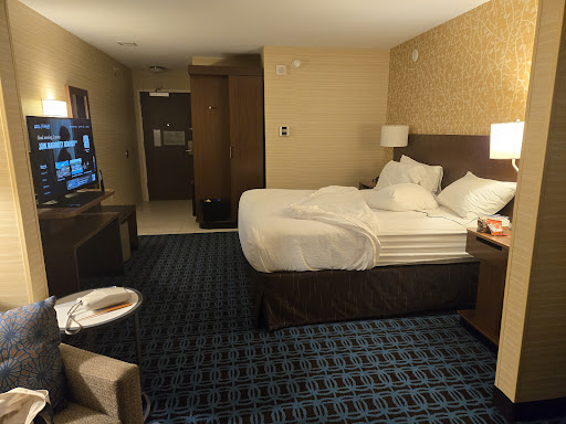 Poor stay in this hotel, even though we were there for only one night. 1) There was no cold water in the water lines: the taps in both the bathroom vanity and the shower ran hot (so that the range of water ran from warm to extremely hot). 2) There was no bar soap for the bathroom vanity. The front desk said the hotel had run out of it. Seriously? No bar soap?? 3) The cleaning staff must be using the wrong product on the tile floors of the guest rooms. The floor in the front area and bathroom was greasy (to the point of possibly causing guests to slip and fall). 4) At breakfast, which was otherwise fine, there was no water available; the beverage choices were juice, coffee, and milk, so that it was not possible to even request a small glass of water (and we asked both the breakfast staff person and the front desk attendant). 5) The view from our room was a short wall and rooftop drainage area over the lobby and registration area. Our assumption was that the hotel must be completely booked, and that this was the last room available. But then we noticed that the hotel appeared to be only 20-25% occupied. Why would registration even assign the very worst room in the house, when most of the property was empty? (And we'd booked a couple weeks in advance, to boot.) We've stayed in Fairfield Inns previously and had good experiences, but this was a...