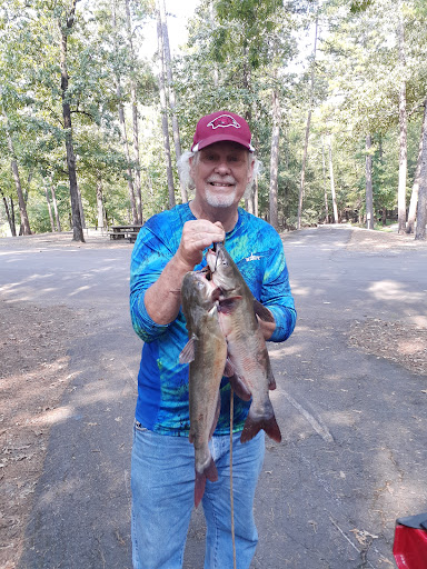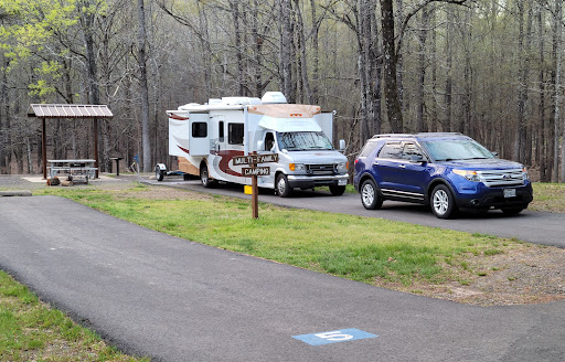 It is a small clean and quiet park, 1 dumpstation with dumpsters. Clean bathroom on a hill. Fish cleaning station. Amphitheater, group shelter and play ground on top of the hill. Boat ramp. Park attendants are nice and helpful. We enjoyed our short stay. Didn't get any fishing done, due to rain. In my opinion, this park is more for small rigs. We have a 32 ft motorhome with a tow dolly for the Explorer and there were only a few spots, I would feel comfortable to back into. 5, 10, 22 & 30 We had booked a Multi family site (5), since we wanted to camp with friends. It was right across the swimming area on the hill. 2 spots site by site. For me most of the sites are scary, right on the edge , backed up on a steep hill. While other sites are short or I tried to figure out , how I would be able to back into it. Also important, bring a Long water hose. Some sites Share a water hook up in between 2 sites , way back....