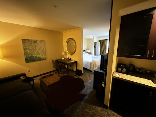 I've been here all week for work and I must say it's one of the nicer hotels I've stayed at. The room is huge for one person. King sized beds sure are big sleeping one person. The room is laid out pretty nicely. All things you could want in a room to yourself for a week. Microwave and mini fridge in the kitchenette. With a sink, coffee and some cabinet space for things. The front room has a sofa, day bed, trundle that is comfortable. There is even a desk and chair that doubles as your dining room, so there's a real space saver. The TV is positioned in a way that makes it visible from your bedroom and the other rooms in your room by simply swiveling one way or another. The shower and toilet have their own room with a door, to keep the rest of the rooms from steam, I guess. Which is handy, so when you are out of the shower and you go the mirror, mirror on the wall, it's not all foggy. The sink is just below the mirror with a good amount of counter space. I had area enough for all the toiletries I had packed to be on the countertop, nice. There's a standard closet with iron and board for those of you packing for business. Several suit hangers as well. And let's not forget that bed. I didn't left the sheets to see who the manufacturer was, but it was super comfortable. With enough pillows and blankets to build a fort or whatever you do with several pillows and blankets. The linens and pillows cases were great, soft and clean. There are 2 lamps, one on either side and two lights above the bed too. So, if you like to read before going to bed, they had you in mind. I didn't have the room serviced during my stay, there wasn't a need for it. Plenty of towels were already in the shower room and I can make my own bed. The front desk person was there if I need anything, like coffee, cups. They have a market next to the front desk, full of foods, snacks and an assortment of beverages for you to choose from. A hot breakfast is served from 6 AM to 10 AM, don't quote me on this though. I would leave for work before it was available. But it's there. Overall I have been very pleased with my stay. If you are traveling for work, you couldn't find a better place IMO. I definitely recommend this hotel for your next...