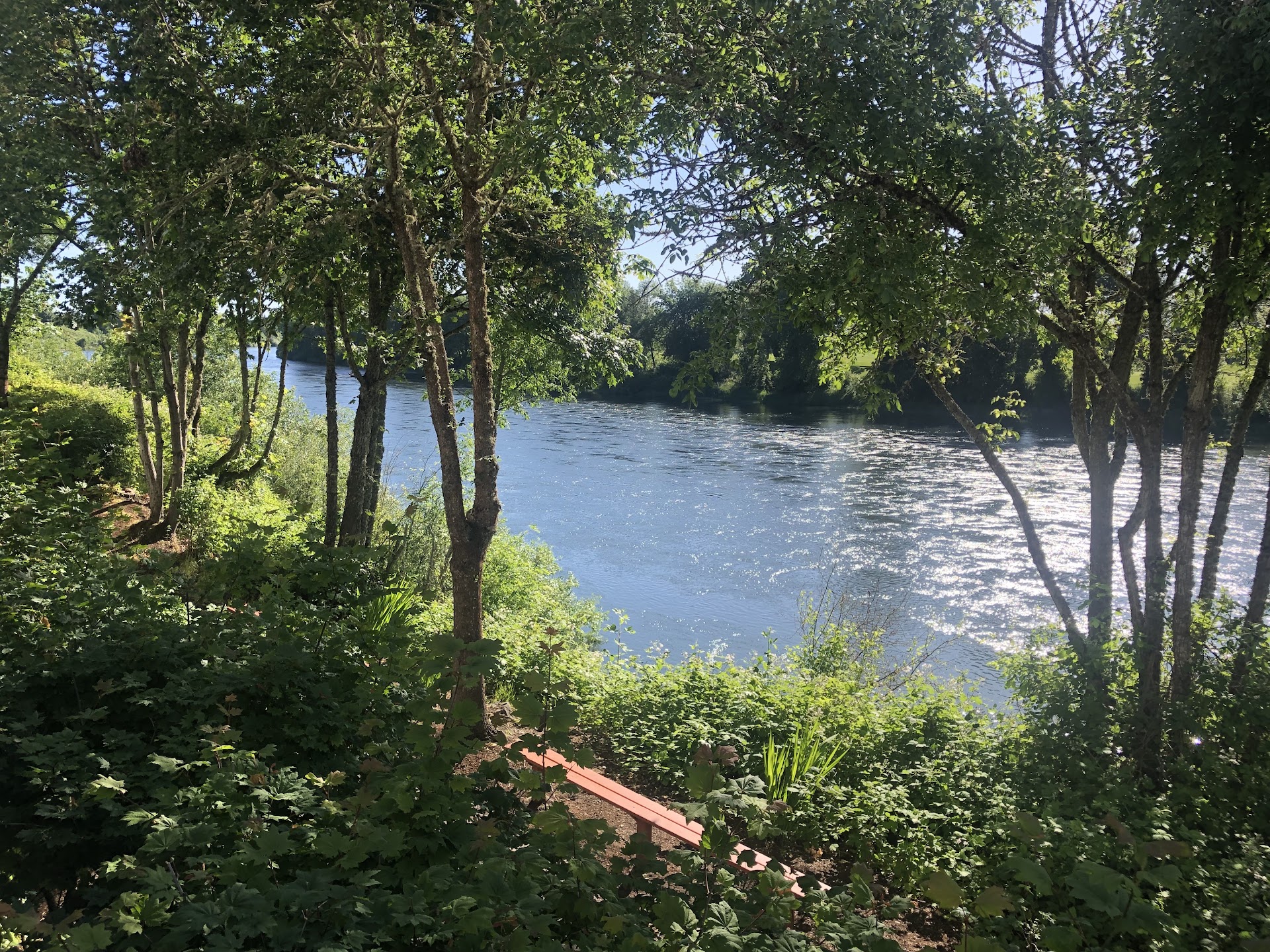 The room was spacious and clean. I wipe down all surfaces in any hotel room as soon as we check in and I only found dirt on the windowsill and A/C which is true of 100% of the hotels I have ever stayed in. The window had a glorious view of the Williamette River facing east. It was absolutely gorgeous, framed by trees and an ever-moving canvas in cool greens and blues. There was a walkway along the river that looped around the hotel with beautiful landscaping. It was an absolute pleasure to take the dog out for potty at this location.