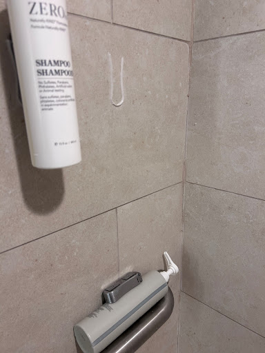 The bathroom was clean and had a bathtub/shower all-in-one. The bathroom was in bad condition with peeling wallpaper, a broken exhaust fan, a broken drain plug in the bathtub, a broken water faucet handle, a loose tile on the floor, and water marks on the ceiling. They did have a full selection of the Zero brand hand soap, body wash, lotion, shampoo, and conditioner all in wall-mounted hand pumps.