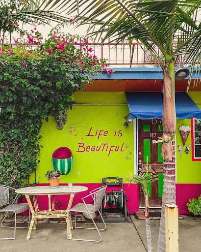 A clean, family run motel facing the courtyard-parking lot, (which is free to motel customers) The courtyard is adorned with happy painting, bright colors, the rooms named after birds. There are old tropical trees and plants, some of which (passion fruit) are used in the cafe. There are lots of flowers, apples in the room, even a little candy. There used to be dinnerware but I notice the plates have only plastic forks now. But there is a table for dinner as well as a real bathtub in most units. A microwave and frig, heater and air conditioner. It's old fashioned - as any self respecting motel ought to be. One of the last of a kind. The beds/pillows are a bit hard, my only room complaint. But the quilts are very homey, nothing corporate about this place. I believe the rooms is cleaned, the sheets are changed only by request. Best of all - Dogs are allowed! You can eat at the Cafe Brazil which is open from late morning to nine pm or so. They usually have socor on the tv, and Brazilian music plays most of the time. It's a very pleasant place to eat. The fried banannas are perfect, the beans and rice are good. The meat - like chicken or beef -could probably be better. They also serve an acai bowl and Brazilian delicacies.It is a gorgeously decorated cafe with Fresh passion fruit mouse, amazing, and a home made apple tart. This is good for kids and pets and only a mile to the beach and the freeway - 20 minutes to anywhere else. There are some pot smokers nowadays but that's everywhere in...