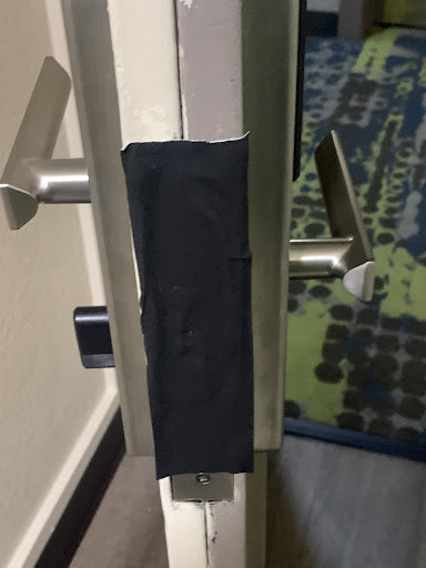 Two other things that were just awful to behold: the side door to the back parking lot had a stick in the bottom propping it open (see photo) because the card reader by the door didn't work. It made me feel very unsafe. Also, our wing had sliding doors that opened to a center patio shared by rooms on the same floor. It was full of tall weeds and ancient brick ruins (don't know how else to describe it).