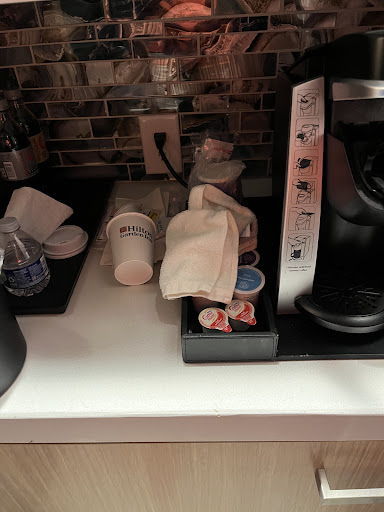 Read moreLocation is great for where we were working and visiting in the Dallas area. Large room, great A/C Nd nice shower However…. I was told that rooms are cleaned on the 2nd and 4th day of a guest’s visit. On my 2nd day, room was not cleaned, and I mentioned it to Caroline at the front desk and was assured that it would be cleaned every day for the rest of my 7-night stay. She provided us with towels and coffee. It was not cleaned the next day. Maids were right outside our door when we left for work on the morning of the 3rd day, so we felt sure the room would be cleaned, but it wasn’t. We DID NOT have the “Do not disturb” hanger on the door. I would otherwise have given the hotel 5 stars, but having to call down for towels, garbage bags, coffee, creamer etc. just prevents me from doing that. PS - When the room was finally “cleaned”, I realized only the towels had been changed, and only two bath towels. (When I had first arrived, there were four bath, hand, and washcloths). There was hair in the sink, tiny papers on the floor, and the coffee area was a mess. See photo. On our 6th night, there were children in the room above running back and forth across the floor. After an hour and because it was getting very late, we called the front desk who sent up security personnel. It stopped for about 5 minutes, but started up again and continued until we called security again. All together, security went three times to the door, and we went twice. An adult answered around midnight, and said “Have a nice night” when we told him that we needed sleep. The running continued until we finally fell asleep around 1:30 AM listening to it. In one of our conversations with the front desk that night, when we insisted that something be done, we were told that would be evicted. Needless to say, we did not stay for our 7th night. Because of the security’s inability to deal with the problem of the running children for 3 late-night hours, I am reducing my 3-star...