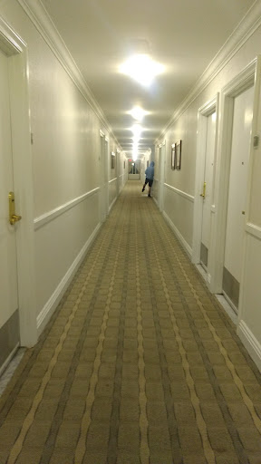 Next, we went to our room where a very pleasant surprise awaited us. Our room was beautiful. Very simply decorated—just perfect. We had a king size bed and a beautiful balcony view of the ocean. We got there just in time for sunset and found it breath taking! As we settled in, we noticed that we each had a nightstand, there was a desk, a chest of drawers that doubled as a pedestal for our large tv (which had several channels and a great picture!), another small table and a very comfortable chair with an ottoman tucked neatly below it. There were two sets of double doors along one wall—both of which automatically lit up when you opened them. Behind one set was a closet with the suitcase rack and wooden hangers inside. Also included was an ironing board and iron. The second set housed a mini kitchen complete with sink, microwave, refrigerator/freezer, cabinets and a stocked Keurig machine! Unbelievable!